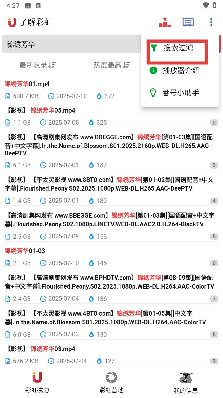 1、打开彩虹磁力后,找到界面右上角的三点图标,点击该图标并选择“搜索过滤”选项。