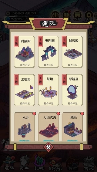 2、之后在这里我们就能看到地府的所有建筑,对它们进行解锁或升级。