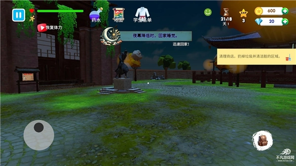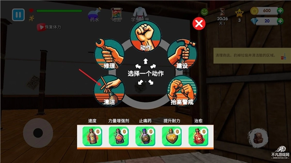 4、接下来我们要清理自己的武馆,点击右下角的背包,在这个界面里能够切换到清洁等各类操作选项。