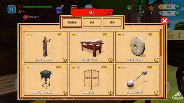 7、还可以到商店中购买各种武馆训练道具,同样的点击建设即可进行放置。