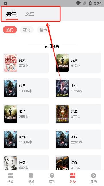 2、点击底部的分类还能够对男频、女频进行切换