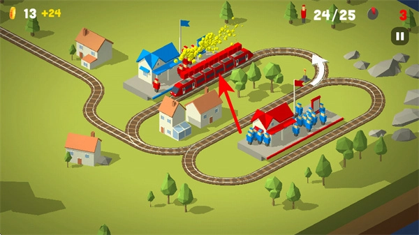 3、当火车到达对应颜色的车站时,会自动完成乘客的上下车操作,同时运输进度会相应累积(例如显示为24/25),需要继续匹配颜色来完成剩余的运输任务,以此通过该关卡。