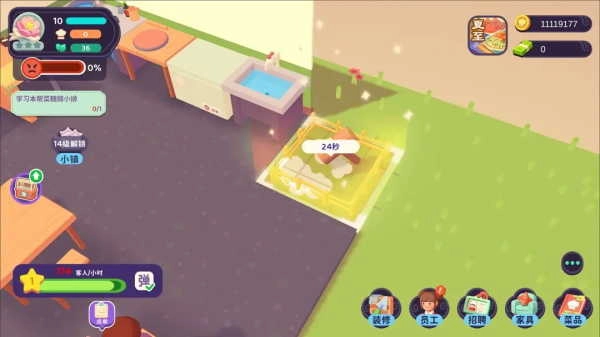 1、扩地:当发现餐厅旁存在可扩地区域时,点击该区域即可发起扩地操作,待倒计时结束后,便能顺利完成地块扩建,从而增加餐厅的使用面积。