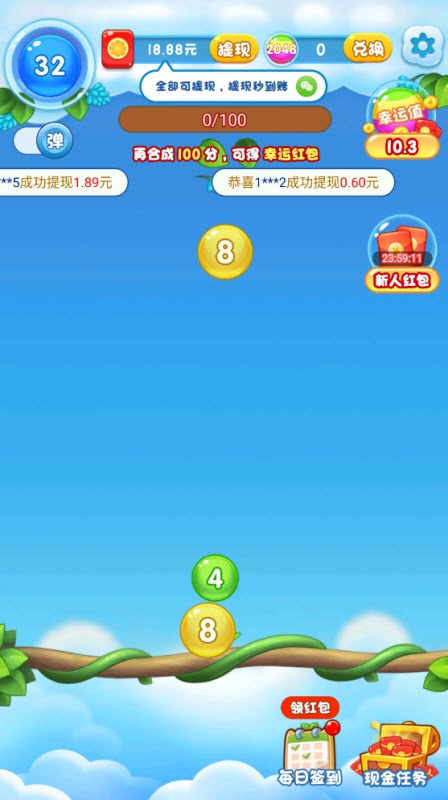 3、每一次成功合并都会生成一个数值翻倍的新小球,玩家需要不断重复这个过程,直到完成2048的目标。