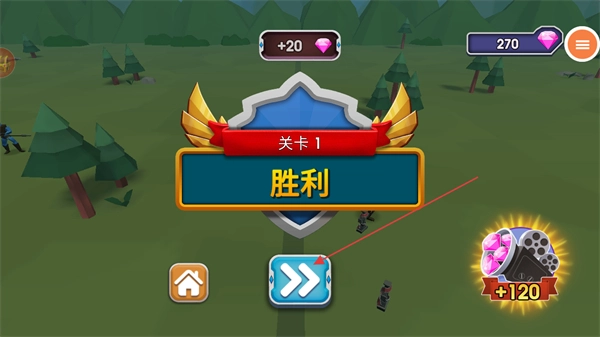 4、在关卡1胜利界面中,可以看到因为战斗胜利获得了20个钻石奖励,点击箭头按钮,即可进入后续关卡。