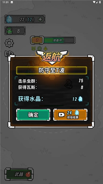 5、游戏采用自动攻击机制,当消灭一波敌人后,玩家可以选择返航。