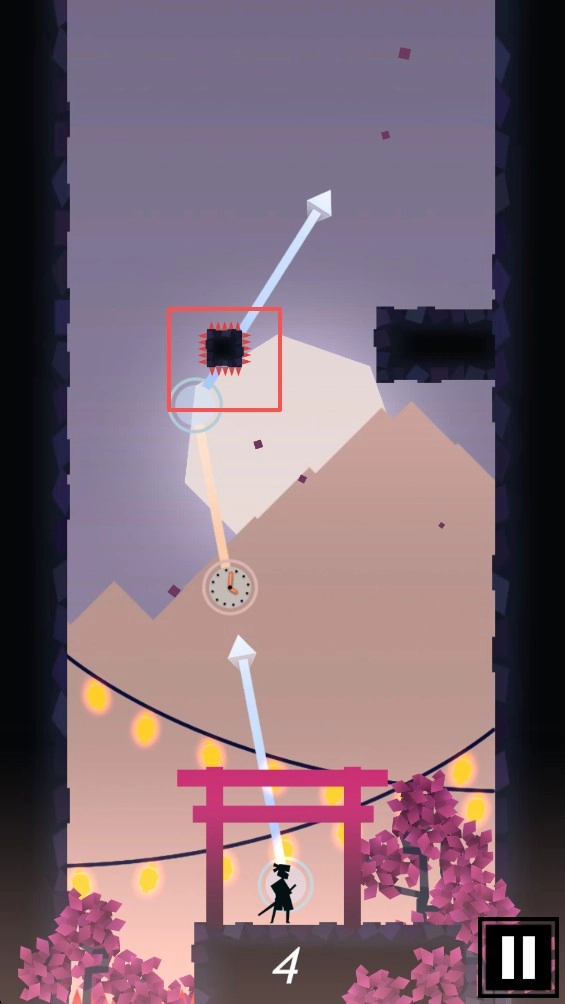 4.点击并划动来让你的忍者跳跃,只要不跳到有尖刺的地方你就可以一直贴在那里,直到下次移动。