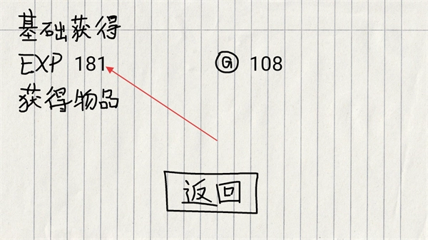 1、这是通关后的奖励界面,界面上显示了基础获得的181点EXP和108个货币,点击界面里的返回按钮,就能回到游戏主界面继续进行后续操作。