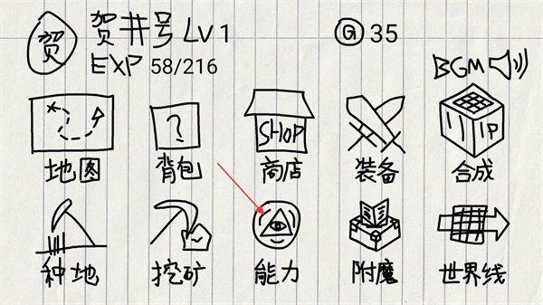 2、这是游戏的主界面,通过通关获得的EXP经验值能够用于升级并获取能力点数。点击能力按钮,即可进入属性加点界面来配置角色属性。