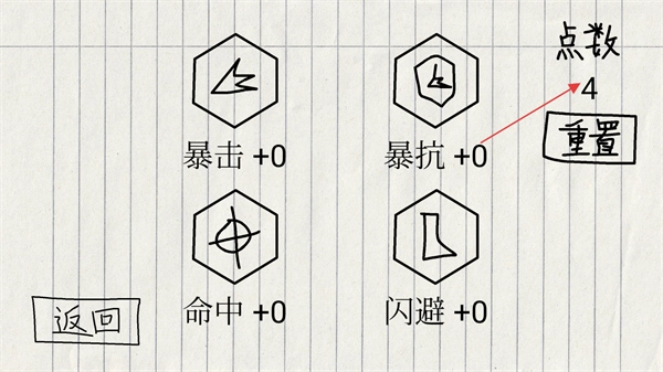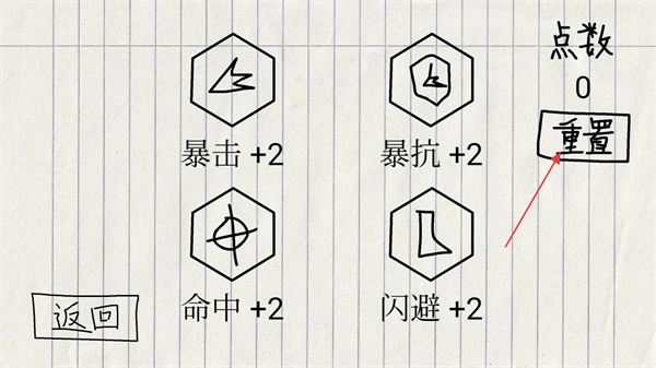 4、这是加点完成后的界面,点数已消耗至0,暴击、暴抗等属性均+2,点击重置按钮,可清空当前加点并重新分配点数。
