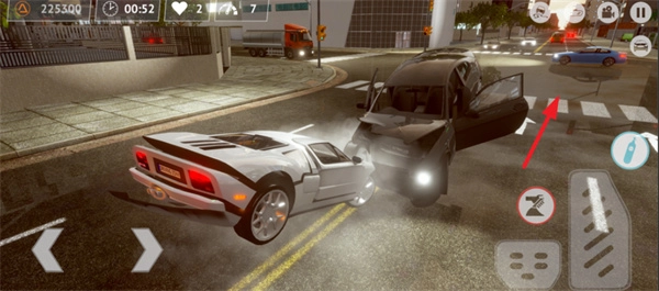 进入游戏后,挑选好想要的汽车,即可进入开放地图参与竞技。游戏界面左下角的两个按键用于控制车辆的移动方向,右下角的两个按键分别负责减速和加速操作。