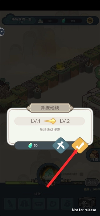 1、当升级地块的提示界面弹出时,点击确认按钮,这是提升地块收益操作,消耗对应资源后地块等级会提升,后续能获得更多修行资源。