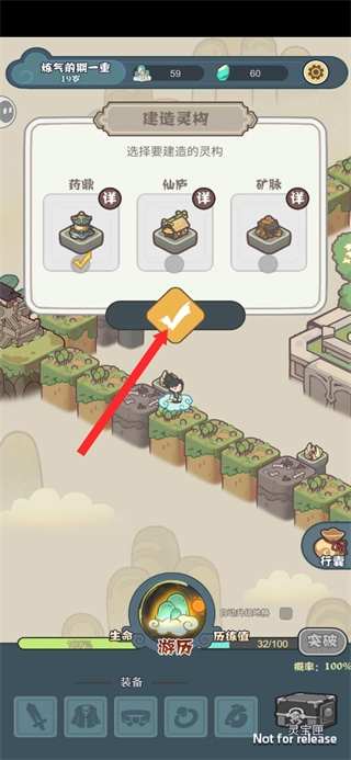 2、进入建造灵构界面后,选定要建造的灵构类型如药鼎,点击确认按钮,这是解锁功能建筑的基础操作,灵构会提供对应的修行辅助效果。