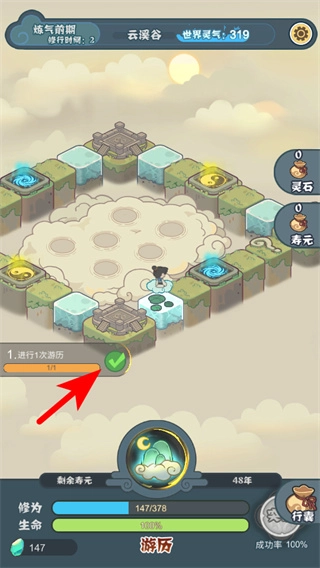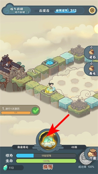 1、在主界面点击游历按钮是推进修行流程的关键操作,点击后角色将进入游历场景,从而获取修为、资源等成长所需的材料。