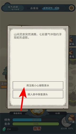 3、当出现与山间灵泉相关的选择界面时,选择“用玉瓶小心摄取泉水”这一选项,完成资源核心操作,就能得到相应的道具,用于辅助修行或兑换奖励。