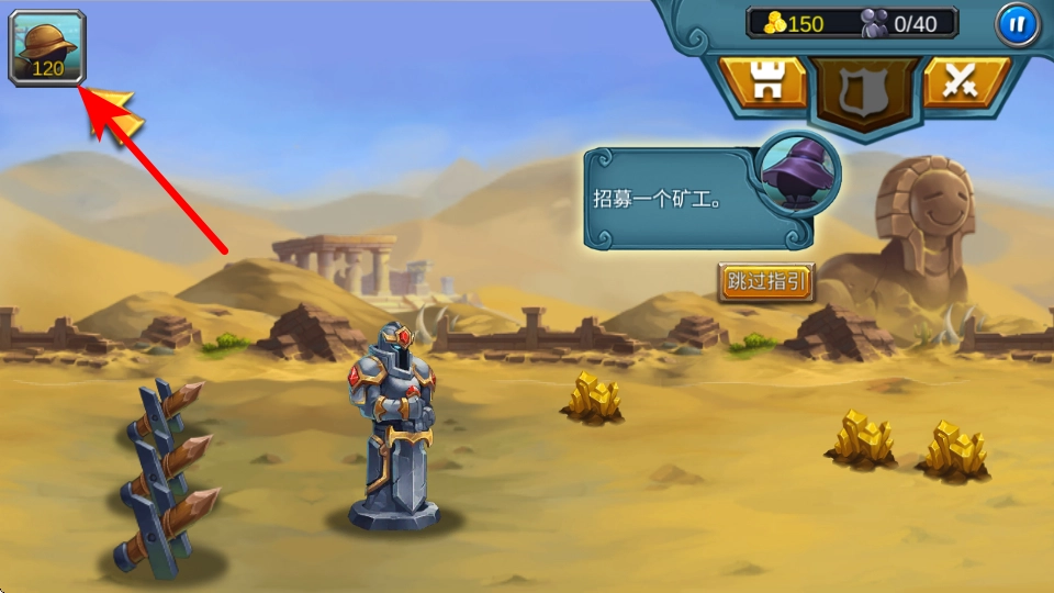 进入战场界面后,依照指示点击招募矿工的选项,这是积累资源的基础操作,能够采集金币,为后续的兵种训练和防御建设提供物资支撑。
