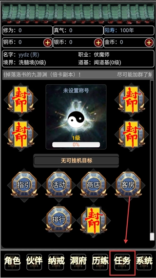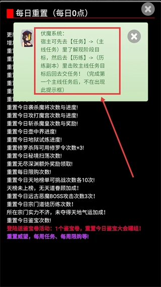 1、新手入门时,建议先查看【伏魔系统】的相关提示,接着通过【任务】板块下的【主线任务】明确当前目标,之后前往【历练】板块中的【历练副本】击败指定目标,完成后提交任务即可推动流程继续进行。