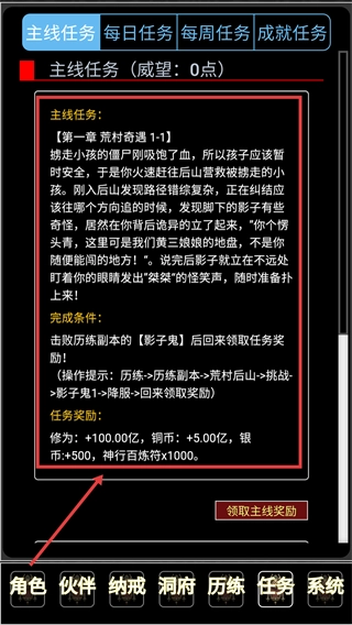 进入主界面后,点击底部的【任务】按钮,查看【主线任务】的剧情和具体要求,清楚当前需要完成的目标,为接下来的操作做好准备。