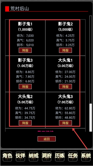 4、进入【荒村后山】副本界面后,依据自身等级挑选适配的怪物,先试着降服【影子鬼1】,通过积累修为与资源来逐步增强实力。