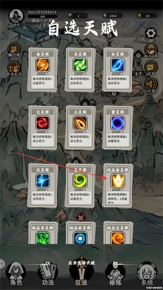 2、在自选天赋界面里,选择极品金灵根这类天赋,其效果是每次修炼增加对应灵力,选后推进角色养成。