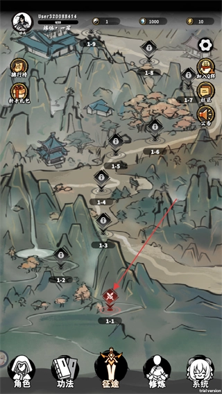 3、在征途界面找到1-1关卡的标识,点击该标识就能进入对应的关卡,开启该关卡的挑战进程。