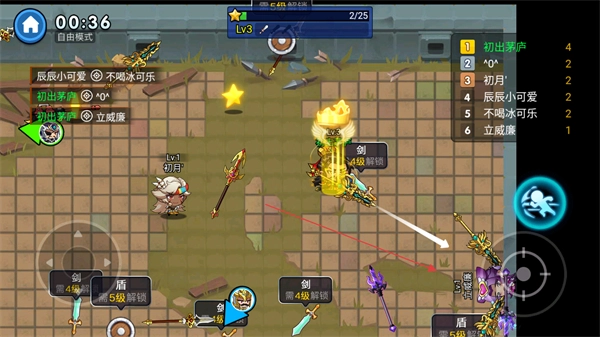 1、操控角色移动,拾取场地中的武器如剑、盾提升战力,同时攻击其他玩家。