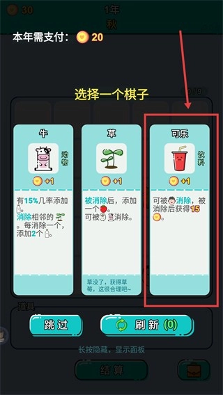 4、选【可乐-饮料】棋子,被消除时一次性得15金币,适合快速积累资金应对年度支付。