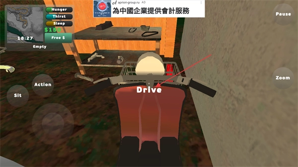 3、靠近场景中的踏板车,看到Drive提示后,点击车辆准备进行驾驶相关操作,同时关注左上角的状态信息。