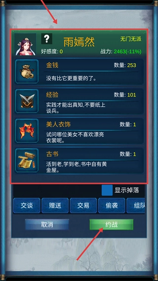 1、和【雨嫣然】进行互动时,能够借助【约战】来增加好感度,还可以收集【金钱】【经验】【美人衣饰】【古书】这些资源来强化自身战力。