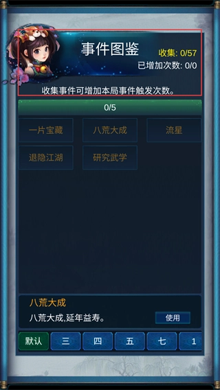 2、打开【事件图鉴】界面,收集从【一片宝藏】到【八荒大成】的相关事件,以此增加本局内事件的触发次数,从而提升收益。