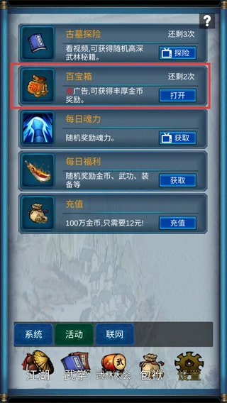 3、在活动页面里找到【百宝箱】,用剩下的次数点击【打开】,通过观看广告来领取丰厚的金币奖励。