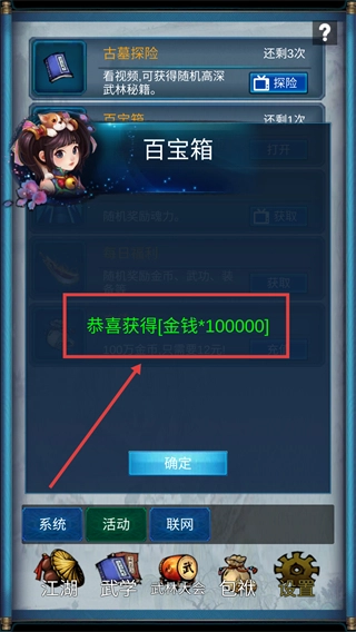4、开启【百宝箱】后,核实已获取【金钱*100000】的奖励,点击【确定】按钮以持续积累资源,为后续进程提供助力。