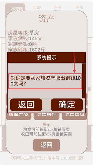 2、系统提示提取铜钱时,需谨慎点击【确定】按钮,避免误操作影响家族资产储备。