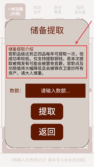 4、储备提取需满足【正四品】品级要求,每年仅限一次且存在风险,输入数额前请务必仔细阅读相关规则。