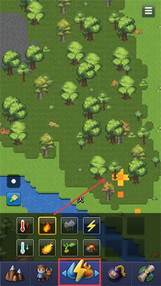3、点击黄色边框圈出的【火】图标,顺着【红色箭头】所指方向,在地图上特定的树木区域释放火焰元素,以此触发场景发生变化。