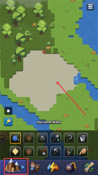 4、选中黄色边框的【水】,沿【红色箭头】在地图的大片空白区域使用水工具,改变地形地貌。