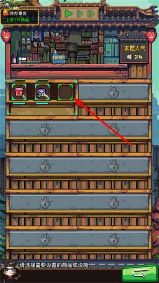5、采购完成后返回店铺,将新商品上架到货架,解锁更多货架与商品,逐步扩大店铺的经营规模。