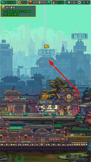 3、完成商品上架后,点击底部的外出按钮,进入城市场景,找到批发市场并点击进入采购商品。