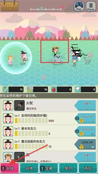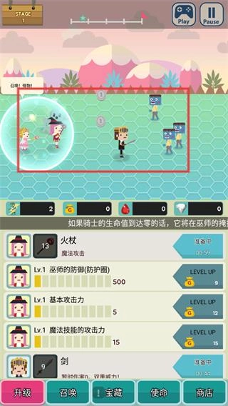 3、操控骑士在巫师的防护加持下击败敌人,点击界面下方的【升级】按钮可以提升角色各项属性,从而进一步增强整体战力。