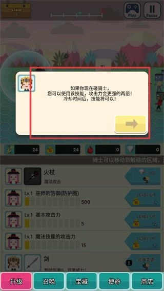 4、按照提示,点击技能按钮释放骑士技能,技能冷却完成后即可再次使用,帮助你顺利推进关卡。