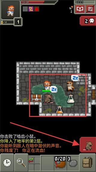2、红框标注的战斗区域,进入【地牢-第2层】后,会出现流血提示,还能听到敌人潜伏的声音。