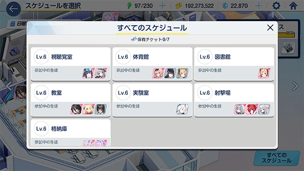 根据自己的需要安排学生的日程来获得好感度(必得)、技能升级材料(概率获得)和碎片(概率获得)。
