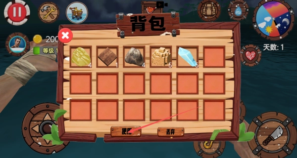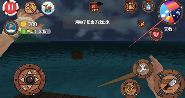 1、按照任务提示操控钩索,瞄准海上漂浮的箱子之类的物资准确投掷,把它们钩回木筏来收集生存所需的资源。