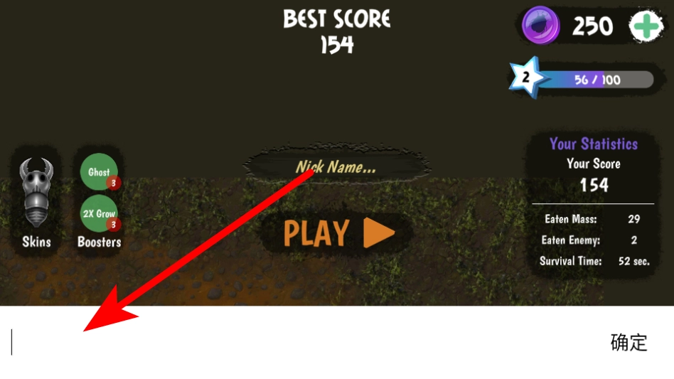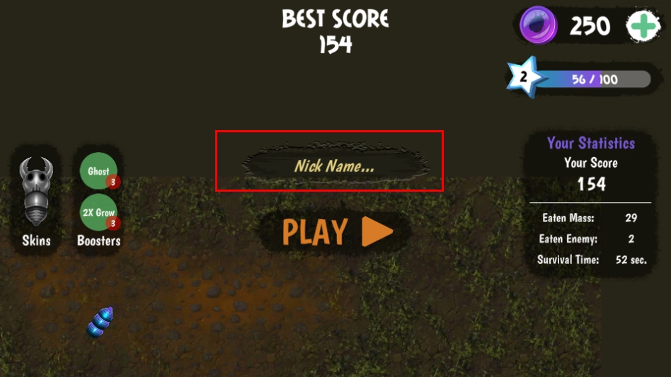 1、进入贪吃瑞拉游戏主界面,点击页面中的Nick Name...输入框,激活起名输入区域。