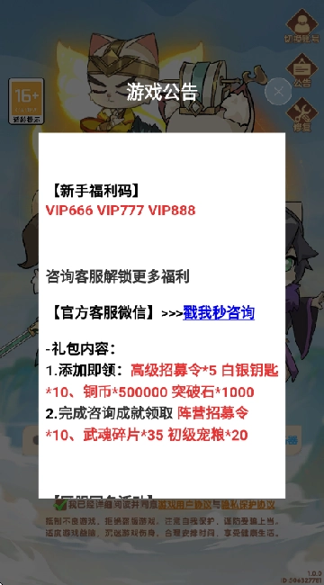 1、用手机号接收验证码就能快速完成注册登录,进入游戏前记得先记下福利码,进去后就能免费领取福利啦。