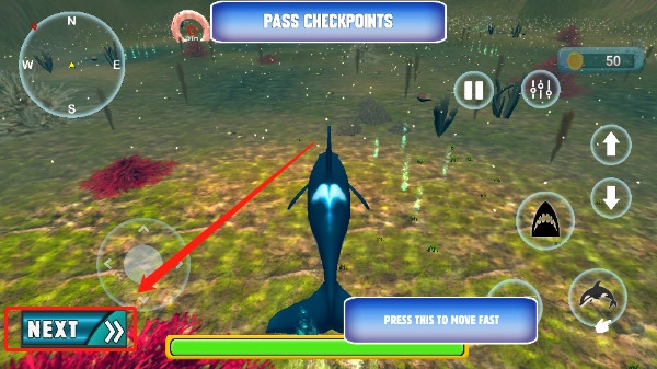 1、用左侧摇杆操控虎鲸的移动方向,右侧按钮用来触发技能动作,要记得时不时浮到海面呼吸,不然虎鲸会持续掉血。
