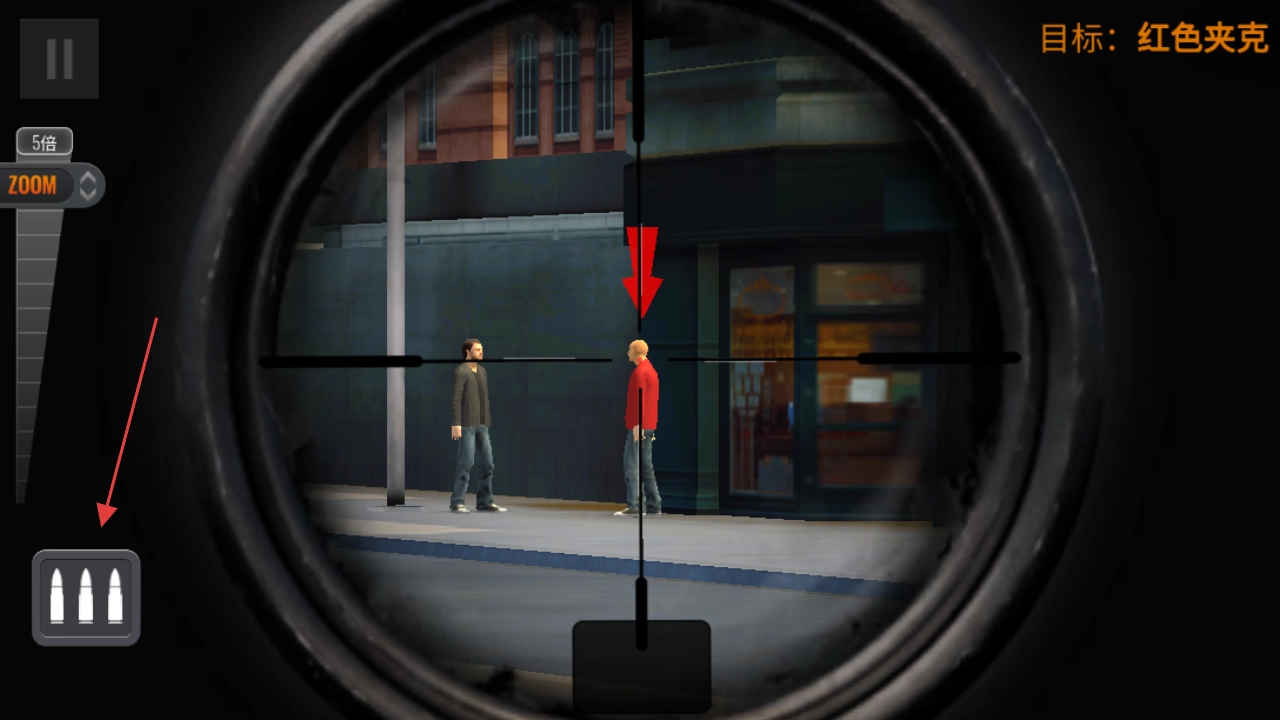 2、使用【5倍】缩放锁定穿红色夹克的目标,确认瞄准后射击即可完成当前狙击任务。