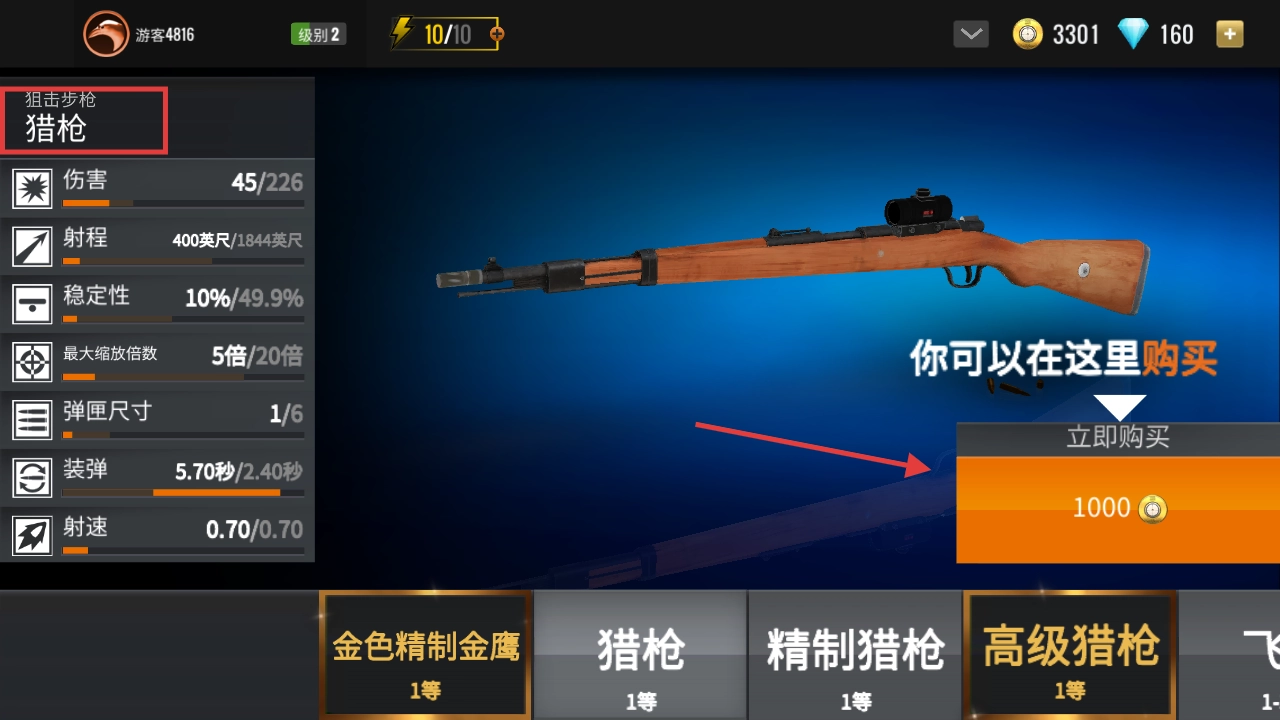 4、在武器界面点击【猎枪】的【立即购买】按钮获取新武器,提升狙击战斗实力。