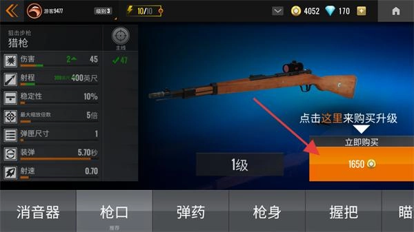 独特的任务设计搭配真实刺激的射击反馈,带来了与众不同的狙击体验,让你在每一场战斗中都能感受到肾上腺素飙升的快感。1、进入武器界面后,点击【立即购买】按钮,消耗【1650金币】即可升级【猎枪-枪口】等相关部件。