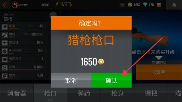 2、弹出【确定吗?】的确认弹窗,确认需消耗【1650金币】来升级【猎枪枪口】,点击【确认】按钮即可完成该操作。